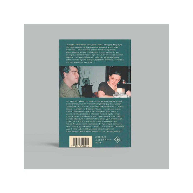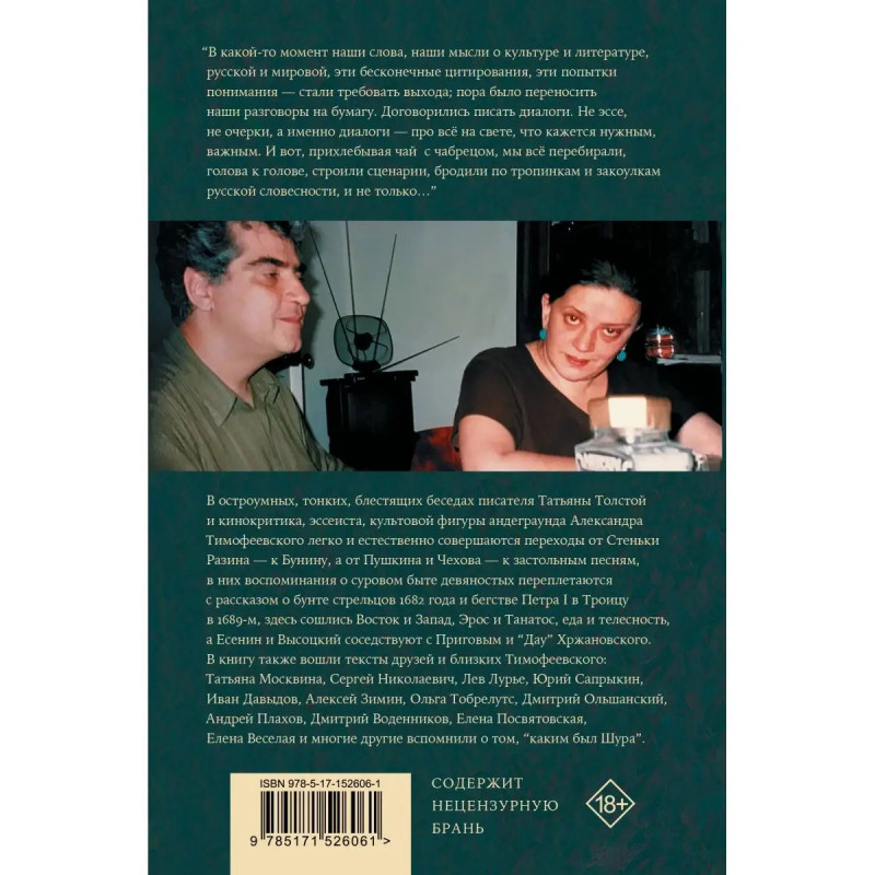 Диалоги, проза, мемуары: книга памяти выдающегося публициста и критика Александра Тимофеевского, собранная Татьяной Толстой. Коллекция тонкой прозы, квинтэссенция остроумной и печальной мудрости, присущей человеку, стоявшему у истоков современной российской интеллектуальной публицистики, непревзойденному мастеру сauserie, уходящего стиля ироничных и интеллектуальных колонок. Культурный разговор: в сборник вошли как отдельные тексты авторов книги, так и их эссе блестящие диалоги о литературе, кинематографе, русской истории и характере.