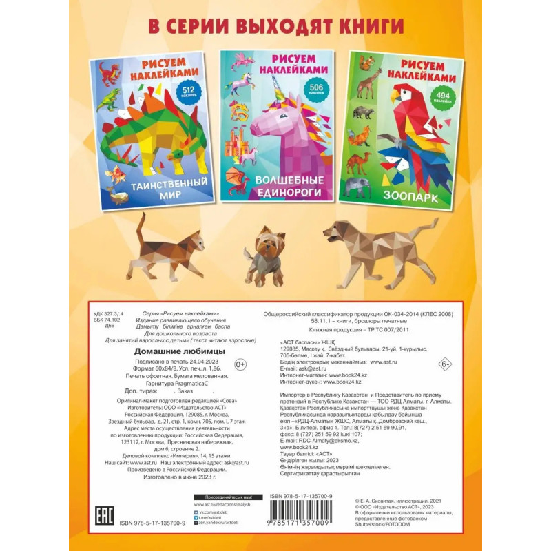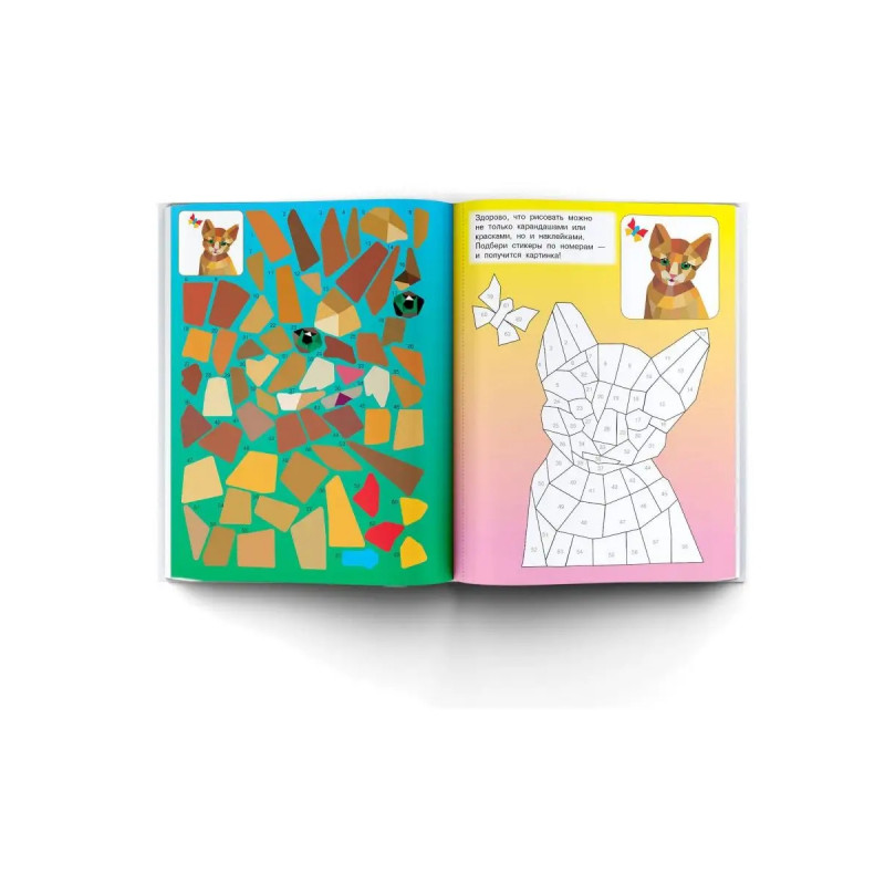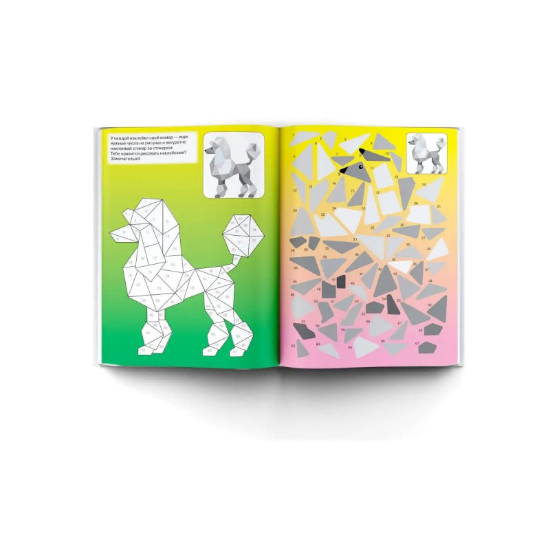В новой серии книг Рисуем наклейками игровые задания с геометрическими стикерами, необыкновенно популярные во всем мире. В уникальной книжке ребят увидят щенков и котиков, которых можно раскрасить стикерами, подобрав наклейки по номерам. Юным художникам обязательно понравятся интересные задания на развитие логики, памяти, внимания, мелкой моторики. Книжка для всех, кто любит рисовать и своими руками создавать коллажи из наклеек. Ребенок сможет своими руками сложить мозаику, шаг за шагом приклеивая на зашифрованное поле рисунка фигурки-наклейки. На каждой странице книги образец рисунка и его символьная схема. Наклейки выкладываются на ячейки с соответствующими числами, на каждую картинку потребуется более 6 стикеров. Забавная собачка или кошечка из стикеров украсит интерьер детской комнаты, станет ярким запоминающимся подарком для друзей и близких. Интересное занятие поможет малышу проявить свои творческие способности, развить мелкую моторику и пространственное мышление, научит внимательности