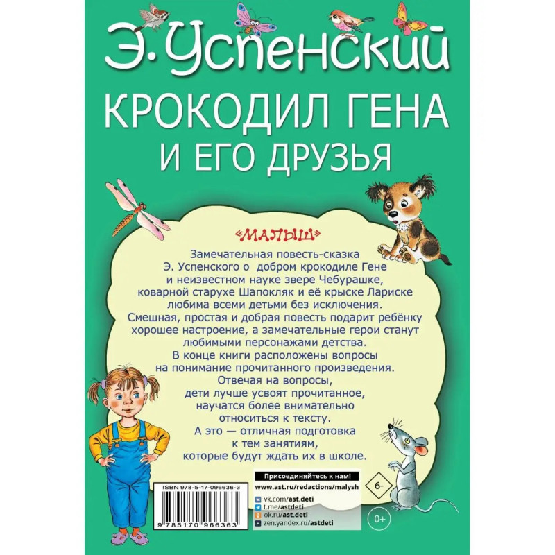 Знаменитая повесть-сказка Э.Успенского "Крокодил Гена и его друзья" с отличными иллюстрациями известных художников С. Бордюга и Н. Трепенок не только станет прекрасным детским чтением, но и научит ребёнка запоминать и пересказывать текст. А помогут в этом вопросы к прочитанному, расположенные в конце книги.
