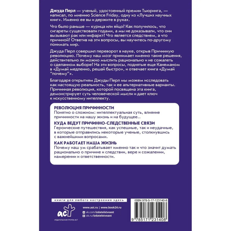Книга о возможностях нашего мышления с точки зрения причинности. Наш мозг хранит бесконечный объем знаний о причинно-следственных связях. Потенциал этого знания невероятно велик. Поддержав его отточенными данными, мы сможем использовать этот орган для решения повседневных задач любого уровня от покупки зубной пасты до лечения тяжелых болезней. Вы умнее ваших данных, говорит автор книги. Новая наука о причинном анализе позволит нам глубже осознать, как мы мыслим, усилит наши врожденные способности к постижению данных в больших и малых объемах. Книга для тех, кто хочет узнать, почему наш ум срабатывает именно так и как им управлять.