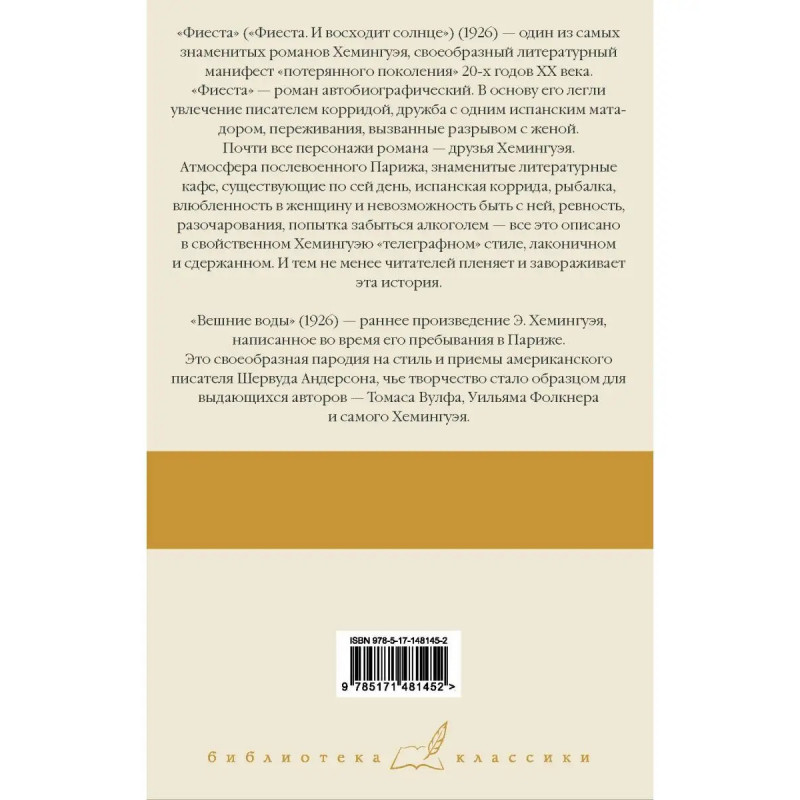 "Фиеста" ("Фиеста. И восходит солнце") (1926) один из самых знаменитых романов Хемингуэя, своеобразный литературный манифест "потерянного поколения" 2-х годов XX века. "Фиеста" роман автобиографический. В основу его легли увлечение писателем корридой, дружба с одним испанским матадором, переживания, вызванные разрывом с женой. Почти все персонажи романы друзья Хемингуэя. Атмосфера послевоенного Парижа, знаменитые литературные кафе, существующие по сей день, испанская коррида, рыбалка, влюбленность в женщину и невозможность быть с ней, ревность, разочарования, попытка забыться алкоголем все это описано в свойственном Хемингуэю "телеграфном" стиле, лаконичном и сдержанном. И тем не менее читателей пленяет и завораживает эта история. "Вешние воды" (1926) раннее произведение Э. Хемингуэя, написанное во время его пребывания в Париже. Это своеобразная пародия на стиль и приемы американского писателя Шервуда Андерсона, чье творчество стало образцом для выдающихся авторов Томаса Вулфа, Уильяма Фолкнера