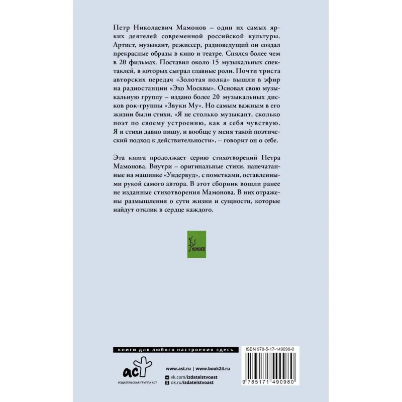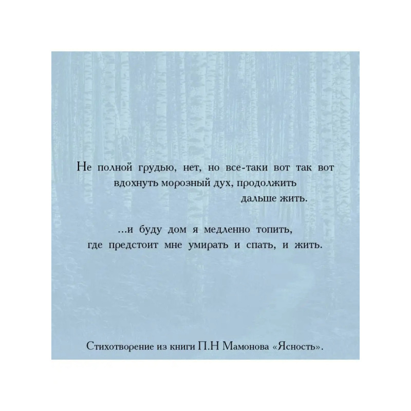 Петр Мамонов запомнился зрителям не только как великолепный актер и музыкант, но и как выдающийся мыслитель, высказывания которого поражают своей глубиной и нестандартным взглядом на жизнь. Ясность это сборник стихотворений Петра Мамонова, в которых он размышляет на самые разные темы, придавая им особое философское звучание. Книга вдохновит читателя ближе познакомиться с творчеством автора, поразмышлять над самыми разными вопросами, с которыми сталкивается думающий человек, и принесет подлинное удовольствие ценителям современной поэзии, имеющей вневременное значение.