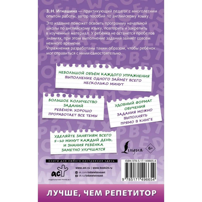 З. Н. Игнашина практикующий педагог с многолетним опытом работы, автор пособий по английскому языку. В данном пособии вы найдете 5 упражнений по английскому языку. Главной особенностью издания является большое количество коротких заданий. С помощью этой книги ученик освоит программу начальной школы по английскому языку, повторит и закрепит изученный материал. У ребенка не останется пробелов в знаниях, при этом выполнение заданий займет совсем немного времени. Пособие рекомендуется использовать в качестве дополнительного материала для повторения и закрепления тем школьной программы. Книга предназначена для учеников начальной школы. Удобный формат издания позволит выполнять все задания прямо в книге и использовать пособие как дома или в школе, так и в дороге.