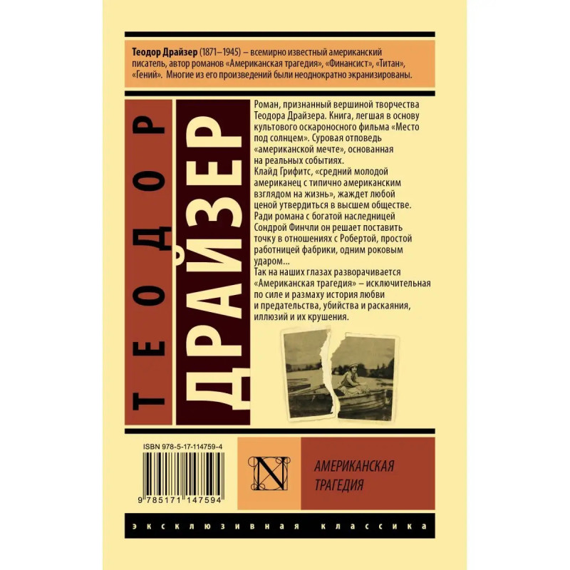 Роман, признанный вершиной творчества Теодора Драйзера. Книга, легшая в основу культового оскароносного фильма "Место под солнцем". Суровая отповедь "американской мечте", основанная на реальных событиях. Клайд Грифитс, "средний молодой американец с типично американским взглядом на жизнь", жаждет любой ценой утвердиться в высшем обществе. Ради романа с богатой наследницей Сондрой Финчли он решает поставить точку в отношениях с Робертой, простой работницей фабрики, одним роковым ударом Так на наших глазах начинает разворачиваться "Американская трагедия" исключительная по силе и размаху история любви и предательства, убийства и раскаяния, иллюзий и их крушения.