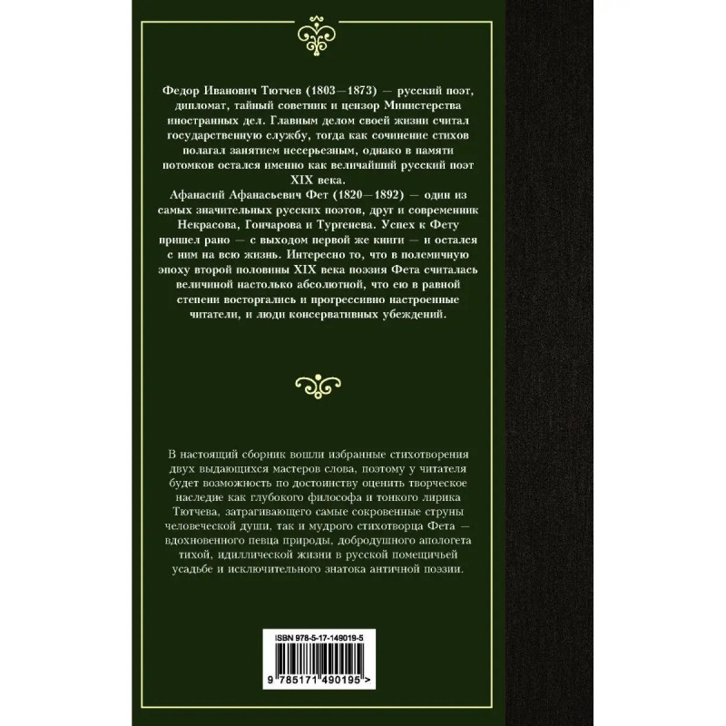 В настоящий сборник вошли избранные стихотворения двух выдающихся мастеров слова, поэтому у читателя будет возможность по достоинству оценить творческое наследие как глубокого философа и тонкого лирика Тютчева, затрагивающего самые сокровенные струны человеческой души, так и мудрого стихотворца Фета вдохновенного певца природы, добродушного апологета тихой, идиллической жизни в русской помещичьей усадьбе и исключительного знатока античной поэзии.