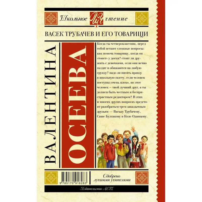 Валентина Александровна Осеева-Хмелёва - известная детская писательница, лауреат Государственных премий. Она мечтала стать актрисой, но вышло так, что однажды она попала в Трудовой комитет для безнадзорных ребят и посвятила свою жизнь трудным детям. Именно здесь Валентина Осеева впервые попробовала писать - она сочиняла истории, рассказы (наиболее полюбившийся детям цикл Волшебное слово), пьесы для своих воспитанников и постепенно выросла в знаменитого писателя, чьи произведения многократно издавались и были экранизированы (Васёк Трубачёв и его товарищи, Динка и другие). Васёк Трубачёв и его товарищи - книга о трёх неразлучных друзьях, о том, как живут простые школьники, какие вопросы и проблемы занимают каждый их день; книга о благородных поступках и неправильном выборе; книга о незаметном взрослении и становлении человека. Для среднего школьного возраста.