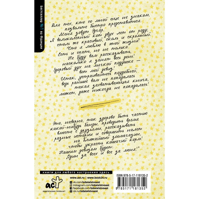 Для тех, кто со мной еще не знаком, позвольте быстро представиться. Меня зовут Эдгар. Я великолепный кот двух лет от роду, столь же красивый, сколь и скромный. Что я люблю в этой жизни? Есть и спать, но не только. Не буду вам рассказывать, насколько я занят весь день! Здоровый дух на мягкой подушке вот мой девиз! Итак, устраивайтесь поудобней, ведь раньше вам не попадалась такая захватывающая книга, может даже никогда не попадалась!