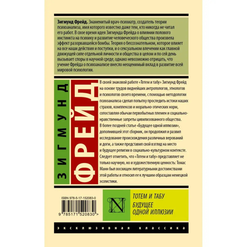 Один из самых значимых трудов прародителя психоанализа Зигмунда Фрейда. Опираясь на труды известных этнографов, антропологов и фольклористов, изучавших обычаи и верования примитивных народов, Фрейд выдвигает идею постепенной эволюции запретов и страхов первобытного человека в современные культурно-этические нормы.