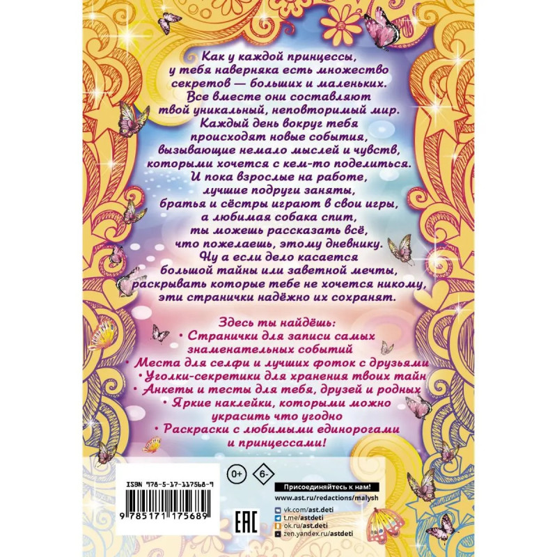 У каждой девочки есть секреты (и совсем маленькие секретики), из которых складывается её неповторимый мир. Школа, увлечения, общение с мамой и папой, братьями и сёстрами, друзьями и подружками, домашними питомцами... И всё это вызывает целую палитру чувств и оригинальные мысли обо всём на свете! Эта красочная книга тоже с секретом. Точнее, она сама -- секрет. Ты держишь в руках дневник, в который можно поместить все свои тайны и хранить их, никому не показывая. Или дать почитать избранные места тем, кому пожелаешь. А еще ты можешь ответить на вопросы анкеты о себе, своих родных и близких... Вот увидишь: пройдёт какое-то время, и не только тебе, но и им будет интересно вспомнить, каким он был -- яркий и цветной мир, навсегда запечатленный на страничках твоего дневника. Для дошкольного возраста.