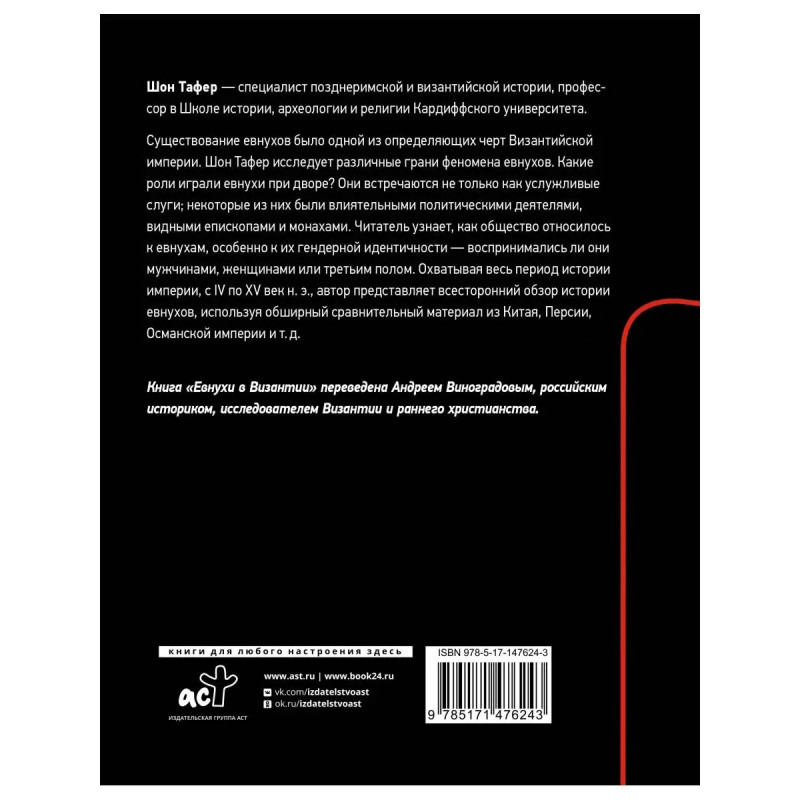 Шон Тафер специалист позднеримской и византийской истории, профессор в Школе истории, археологии и религии Кардиффского университета. Существование евнухов было одной из определяющих черт Византийской империи. Шон Тафер исследует различные грани феномена евнухов. Какие роли играли евнухи при дворе? Они встречаются не только как услужливые слуги; некоторые из них были влиятельными политическими деятелями, видными епископами и монахами. Читатель узнает, как общество относилось к евнухам, особенно к их гендерной идентичности воспринимались ли они мужчинами, женщинами или третьим полом. Охватывая весь период истории империи, с IV по XV век н. э., автор представляет всесторонний обзор истории евнухов, используя обширный сравнительный материал из Китая, Персии, Османской империи и т. д. Книга "Евнухи в Византии" переведена Андреем Виноградовым, российским историком, исследователем Византии и раннего христианства.