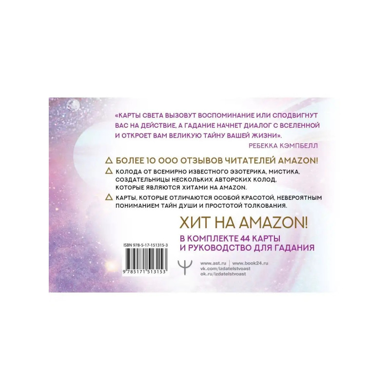 Уникальное подарочное издание одной из самых популярных колод на Amazon не оставит равнодушным никого, кому близок мир Таро и Оракулов. Колоды всемирно известного мистика, эзотерика Ребекки Кэмпбелл отличаются особой женственной красотой, невероятной тонкостью понимания Души и простотой толкования. Каждая карта в колоде "Таро. Свет Вселенной. Задай свой самый сокровенный вопрос" пронизана магией Божественного женского голоса. Сюрреалистичные образы помогут увидеть истину, дадут ответы на любые, даже самые сокровенные вопросы, а особая энергия Света озарит ваш путь. Колода включает в себя 44 карты пяти видов: 1. Карты подтверждения дают однозначный ответ на ваш вопрос, по принципу "да нет". Они рассчитаны на быстрое и четкое прояснение ситуации, каковы бы ни были привходящие обстоятельства. 2. Карты запроса помогут вам услышать подсказки, озвучить их и руководствоваться ими в своих действиях. 3. Карты действия вдохновляют вас на совершение того или иного поступка, побуждают перейти от мыслей к действию. 4