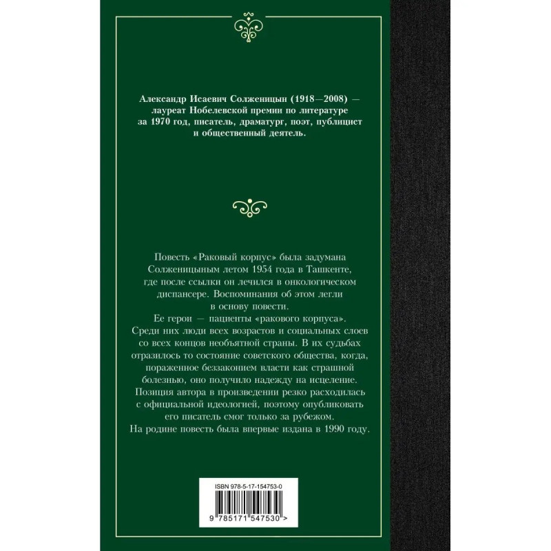 Раковый корпус одна из повестей автора, основанных на наблюдениях и воспоминаниях о тяжёлых для Советского Союза временах. Александр Солженицын выдающийся русский писатель, автор книг Архипелаг ГУЛАГ и Один день Ивана Денисовича, лауреат Нобелевской премии по литературе. Неоднократно запрещенный к печати на родине, он обрел популярность за границей, и лишь после 199 года в России.