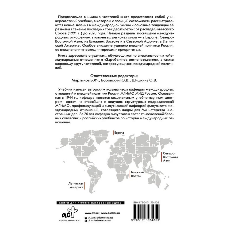Книга представляет собой университетский учебник по современной истории международных отношений, охватывающей период от распада Советского Союза (1991 г.) до глобального кризиса, вызванного пандемией COVID- 19 (22 г.). В ней с позиций системности рассматриваются новые явления в международной жизни и основные тенденции ее развития за последние 3 лет. Четыре раздела посвящены международным отношениям в Европе, Северо- Восточной Азии, на Ближнем Востоке и в Северной Африке, в Латинской Америке. Особое внимание уделено внешней политике России, ее внешнеполитическим интересам и приоритетам в регионах мира, рассматриваемых в книге. Учебник адресован студентам высших учебных заведений, обучающимся по направлениям подготовки и специальностям "Международные отношения" и "Зарубежное регионоведение", а также магистрантам и аспирантам вузов, преподавателям, научным сотрудникам и всем, кто интересуется современными международными отношениями и внешней политикой России.