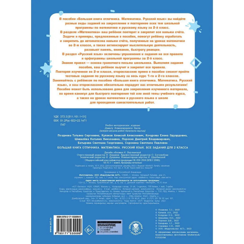 В пособии "Большая книга отличника. Математика. Русский язык" вы найдете разные виды заданий на закрепление и повторение всех тем школьной программы по математике и русскому языку за 2-й класс. В разделе "Математика" ваш ребенок повторит и закрепит все навыки счета. Задачи и примеры, предложенные в пособии, помогут ребенку отработать и закрепить до автоматизма навыки счета, полученные на уроках математики во 2-м классе, а также активизируют мыслительную деятельность, разовьют память, внимание, быстроту реакции. В раздел "Русский язык" включены упражнения и задания на все правила и орфограммы школьной программы за 2 класс. Знание правил основа грамотного письма школьника. Выполняя задания пособия, ваш ребенок выучит и закрепит все правила. Повторяя изученное во 2 классе, второклассник прямо в пособии сможет пройти тестовые задания по русскому языку за весь курс 1 и 2 классов. Занимайтесь с ребенком по пособию "Большая книга отличника. 2 класс", и ваш второклассник обязательно порадует вас отличными результ