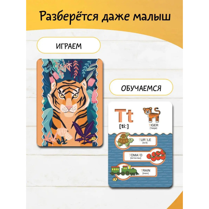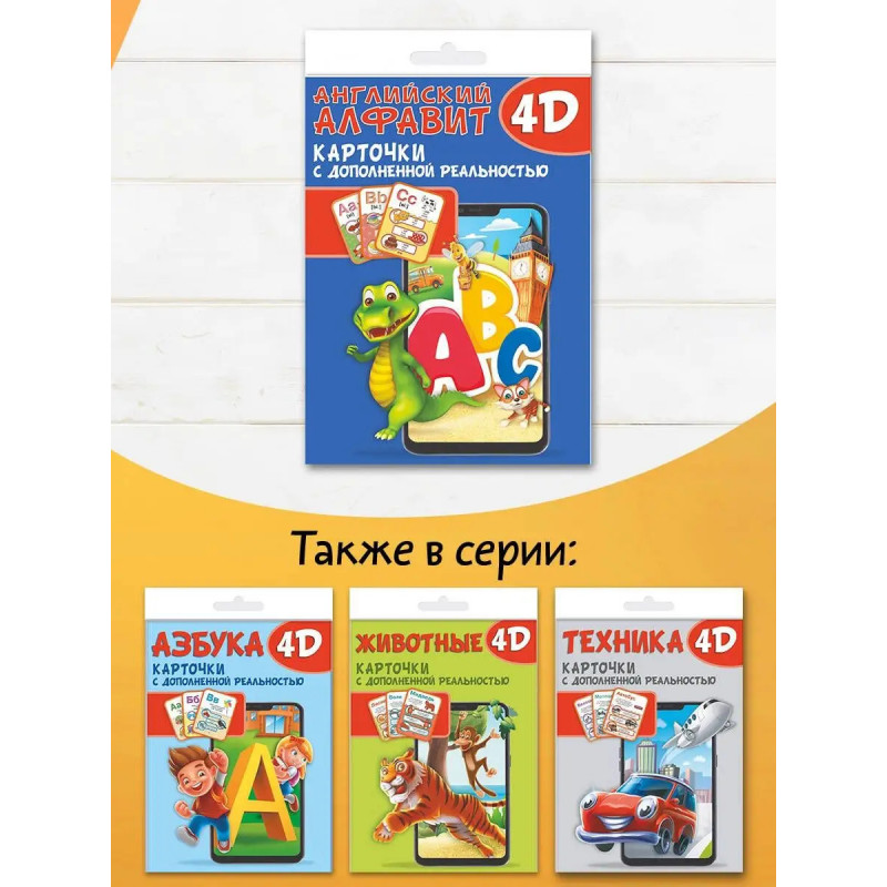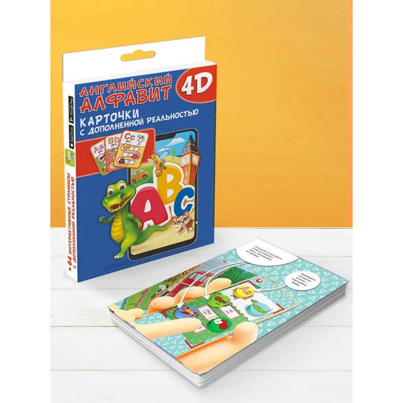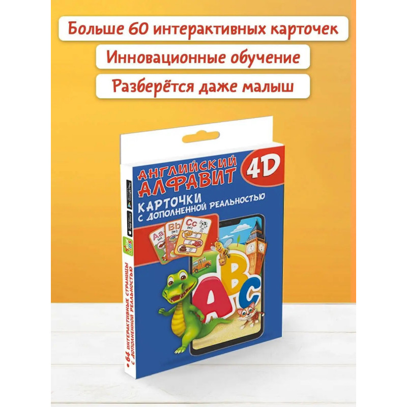 Этот уникальный набор из интерактивных обучающих карточек познакомит ребёнка с буквами и словами английского языка. В ходе увлекательной игры с помощью дополненной реальности малыш с удовольствием начнёт осваивать азы английского языка, сможет запомнить графический образ буквы английского алфавита и услышать, как она правильно произносится. Активируя на экране мобильного устройства кнопки с картинками, ребёнок прослушает и выучит слова английского языка, которые начинаются на эту букву, а также познакомится со счётом до десяти, названиями цветов и форм, времён года и дней недели на английском языке. Чтобы маленький почемучка не заскучал, мы предлагаем ему поиграть с виртуальной моделью, которой он сможет самостоятельно управлять с помощью кнопок с экрана мобильного телефона или планшета. В результате регулярных занятий и игр с этими карточками ребёнку будет по силам запомнить буквы английского алфавита и более сотни слов этого языка с переводом.