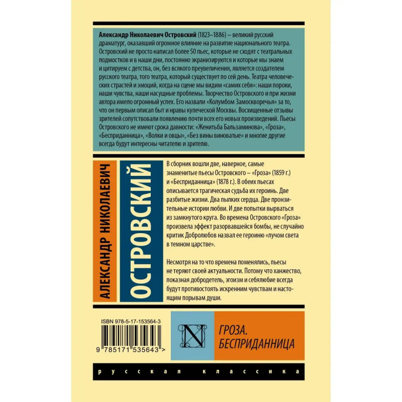 В сборник вошли две, наверное, самые знаменитые пьесы Островского "Гроза" (1859 г.) и "Бесприданница" (1878 г.). В обеих пьесах описывается трагическая судьба их героинь. Две разбитые жизни. Два пылких сердца. Две пронзительные истории любви. И две попытки вырваться из замкнутого круга. Во времена Островского "Гроза" произвела эффект разорвавшейся бомбы, не случайно критик Добролюбов назвал ее героиню "лучом света в темном царстве". Несмотря на то, что времена поменялись, пьесы не теряют своей актуальности. Потому что ханжество, показная добродетель, эгоизм и себялюбие всегда будут противостоять искренним чувствам и настоящим порывам души.