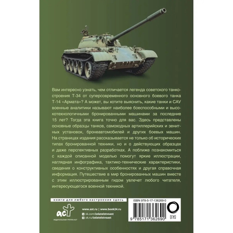 Вам интересно узнать, чем отличается легенда советского танкостроения Т-34 от суперсовременного основного боевого танка Т-14 "Армата"? А может, вы хотите выяснить, какие танки и САУ военные аналитики называют наиболее боеспособными и высокотехнологичными бронированными машинами за последние 15 лет? Тогда эта книга точно для вас. Здесь представлены основные образцы танков, самоходных артиллерийских и зенитных установок, бронеавтомобилей и других боевых машин. На страницах издания рассказывается не только об исторических типах бронированной техники, но и о действующих образцах и даже перспективных разработках. А поближе познакомиться с каждой описанной моделью помогут яркие иллюстрации, наглядная инфографика, тактико-технические характеристики, сведения о конструктивных особенностях и другая справочная информация. Путешествие в мир бронированных машин вместе с этим иллюстрированным гидом увлечет любого читателя, интересующегося военной техникой.