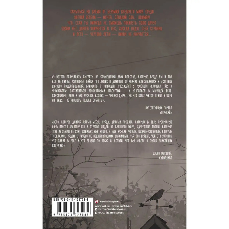 Скрыться на время от безумия внешнего мира среди уютной зелени мечта, сладкий сон кошмар! Что, если ты НИКОГДА не сможешь покинуть свою дачу? Связи нет, дорога упирается в лес, соседи ведут себя странно, и лето чертово лето! никак не кончается... Роман вошел в лонг-лист премий "Большая книга", "Ясная Поляна", "Интерпресскон" и получил премии "Новые горизонты" и "Мастера ужасов".