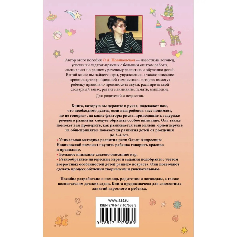 О чем эта книга Интересные игры и задания для развития речи созданы по авторской методике Ольги Андреевны Новиковской известного логопеда, успешного педагога-практика с большим опытом работы. Кому эта книга будет интересна Уникальное пособие разработано в помощь родителям и логопедам, а также воспитателям детских садов. Книга предназначена для совместных занятий взрослого и ребенка. Каковы особенности этой книги Уникальная методика развития речи помогает научить ребенка говорить красиво и правильно. Большое внимание уделено описанию игр, которые позволяют сделать работу над речью творческим, увлекательным процессом. Интересные задания подобраны с учетом возрастных особенностей детей раннего возраста.