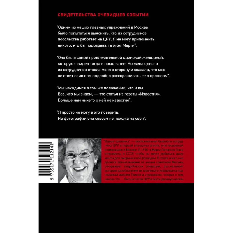Её муж, агент ЦРУ, погиб в ходе лаосской гражданской войны. Поэтому с советскими коммунистами у неё были личные счеты. В серии Разведкорпус вышла автобиография Марты Петерсон, первой женщины-агента ЦРУ в Москве. КГБ долгое время не обращало на неё внимания, потому что просто не могло представить себе, что столь важной оперативной работой в ЦРУ может заниматься женщина. Ее деятельность в Москве была напрямую связана с еще одним легендарным шпионом Александром Огородником, завербованным Центральным разведывательным управлением США под кодовым именем Тригон и ставшим в итоге одним из самых эффективных и важных шпионов, работающих на Запад. Впоследствии Андропов даст материалы дела Тригона писателю Юлиану Семенову и поручит ему создать на основе этих материалов роман. Так появится книга ТАСС уполномочен заявить. Благодаря мемуарам Петерсон у нас есть возможность взглянуть на эту историю с другой стороны, со стороны американских спецслужб. А заодно и увидеть жизнь в СССР семидесятых годов глазами американки