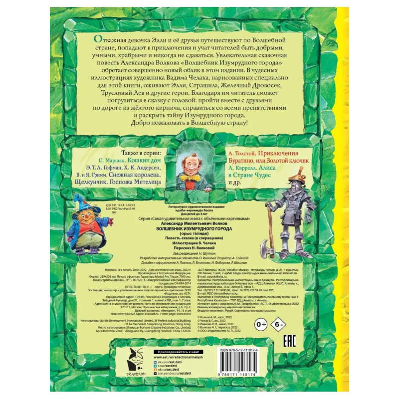 Уникальная подарочная книга большого формата на плотном картоне в твердом переплете. Любимая повесть-сказка "Волшебник Изумрудного города" А. М. Волкова с рисунками современного классика отечественной детской иллюстрации Вадима Челака в совершенно необыкновенном оформлении! В книге вас ждут: - объемные поп-апы - вырубка на обложке и постраничная вырубка внутри - интерактивные элементы почти на каждом развороте Книга будет интересна: Родителям детей дошкольного и младшего школьного возраста Фанатам художника В. Челака и "Волшебника Изумрудного города" А. М. Волкова Коллекционерам книг-панорам Любителям "живых" иллюстраций