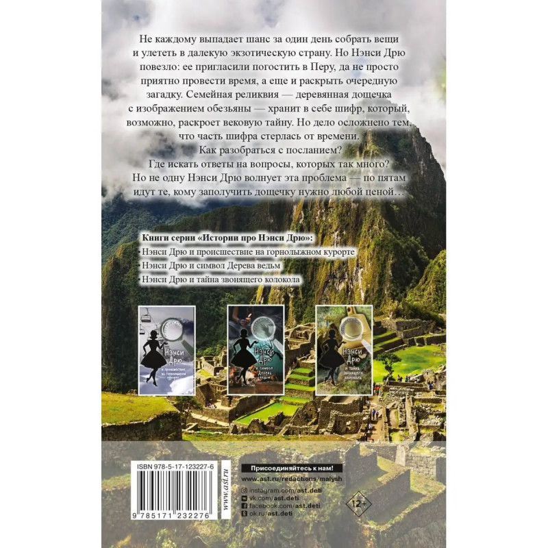 О способности Нэнси Дрю раскрывать даже самые сложные и запутанные дела известно далеко за пределами ее родного городка Ривер-Хайтс. На этот раз юная сыщица со своими верными спутницами Бесс и Джордж отправляется в Перу, чтобы помочь их новой подруге Карле раскрыть загадку семейной реликвии деревянной дощечки с изображением обезьяны. Об этой вещице известно только то, что сделал ее человек по имени Агилар, который зашифровал на ней послание. Но в этом послании скрыто нечто такое, за чем разворачивается самая настоящая охота недоброжелателей. Для среднего школьного возраста.