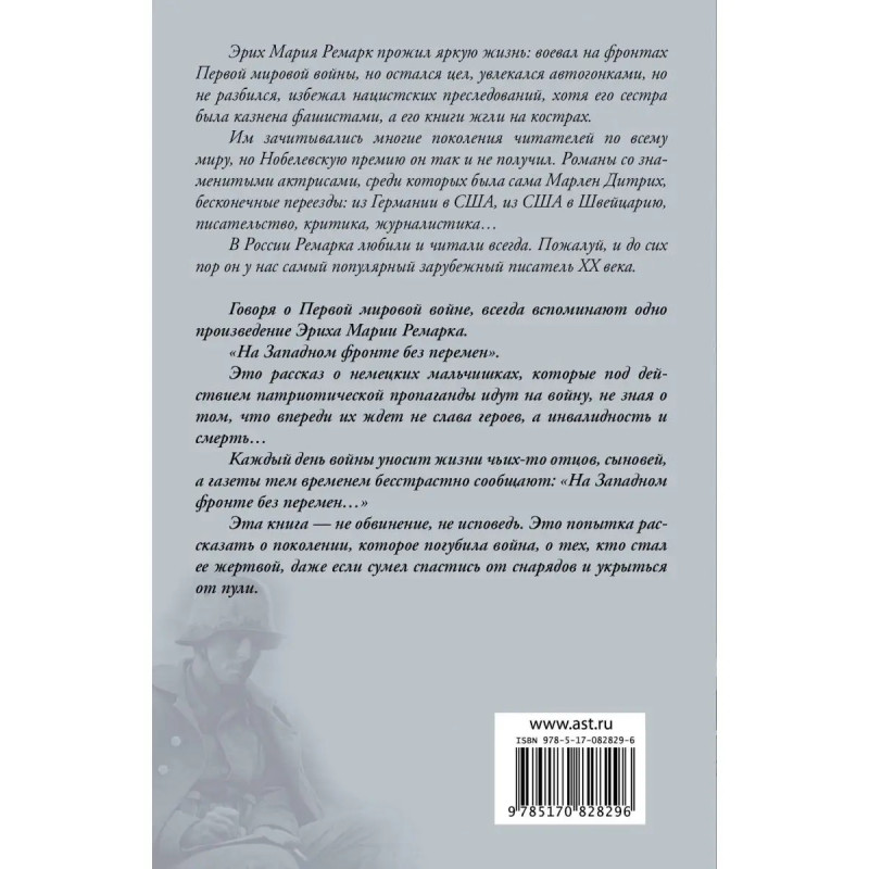 Говоря о Первой мировой войне, всегда вспоминают одно произведение Эриха Марии Ремарка. "На Западном фронте без перемен". Это рассказ о немецких мальчишках, которые под действием патриотической пропаганды идут на войну, не зная о том, что впереди их ждет не слава героев, а инвалидность и смерть Каждый день войны уносит жизни чьих-то отцов, сыновей, а газеты тем временем бесстрастно сообщают: "На Западном фронте без перемен..." Эта книга не обвинение, не исповедь. Это попытка рассказать о поколении, которое погубила война, о тех, кто стал ее жертвой, даже если сумел спастись от снарядов и укрыться от пули.