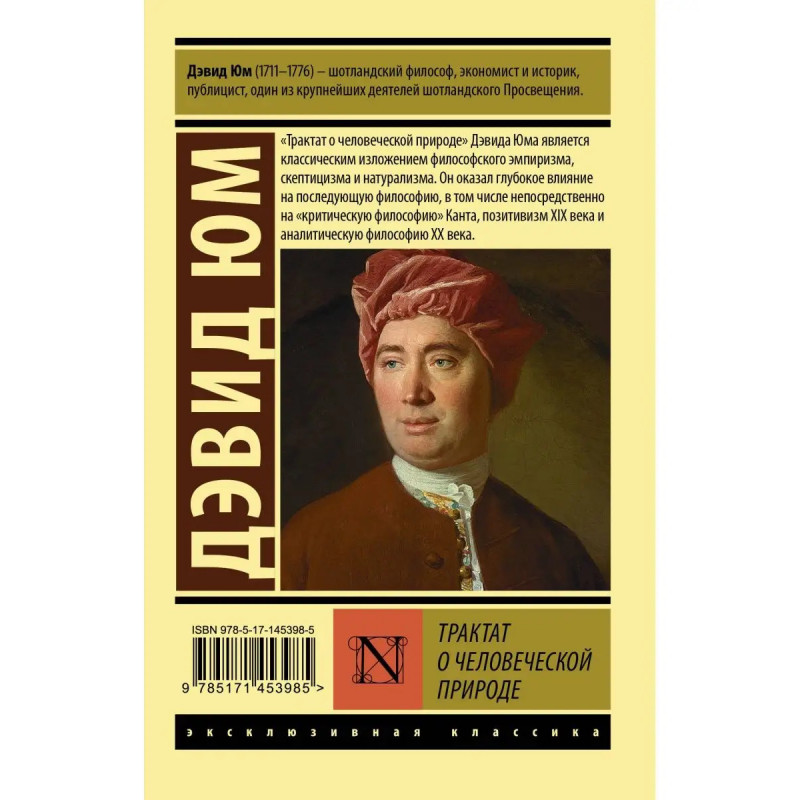 Дэвид Юм (1711-1776) шотландский философ, экономист и историк, публицист, один из крупнейших деятелей шотландского Просвещения. "Трактат о человеческой природе" Дэвида Юма является классическим изложением философского эмпиризма, скептицизма и натурализма. Он оказал глубокое влияние на последующую философию, в том числе непосредственно на "критическую философию" Канта, позитивизм XIX века и аналитическую философию ХХ века.