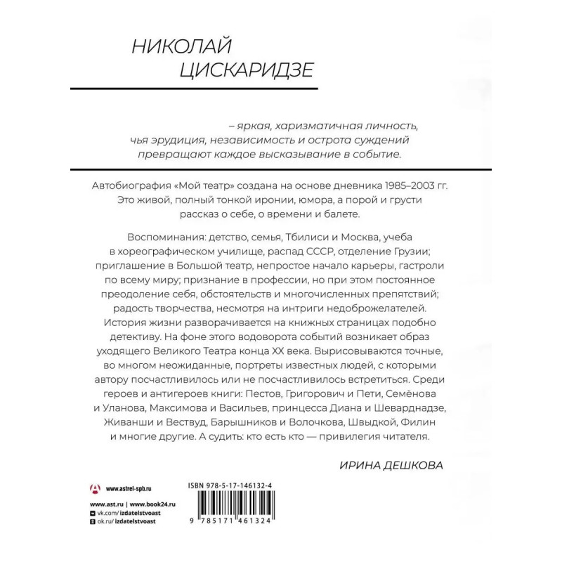 Николай Цискаридзе прошел большой и сложный путь от поступления в Тбилисское хореографическое училище к вершинам театрального Олимпа. Ему рукоплескали зрители всего мира. Но история этого успеха не похожа на сказку. Карьера артиста наполнена как радостью успехов, так и горечью утрат, драматизмом многочисленных жизненных и профессиональных коллизий. Благодаря книге Мой театр вы побываете в солнечном Тбилиси, увидите, как маленький Ника идет вместе с мамой смотреть фильм Феллини, убедитесь, каким трудом наполнены дни ученика хореографического училища, послушаете, о чем говорят в скрытых от посторонних глаз и ушей гримерных Большого театра и Парижской оперы.
