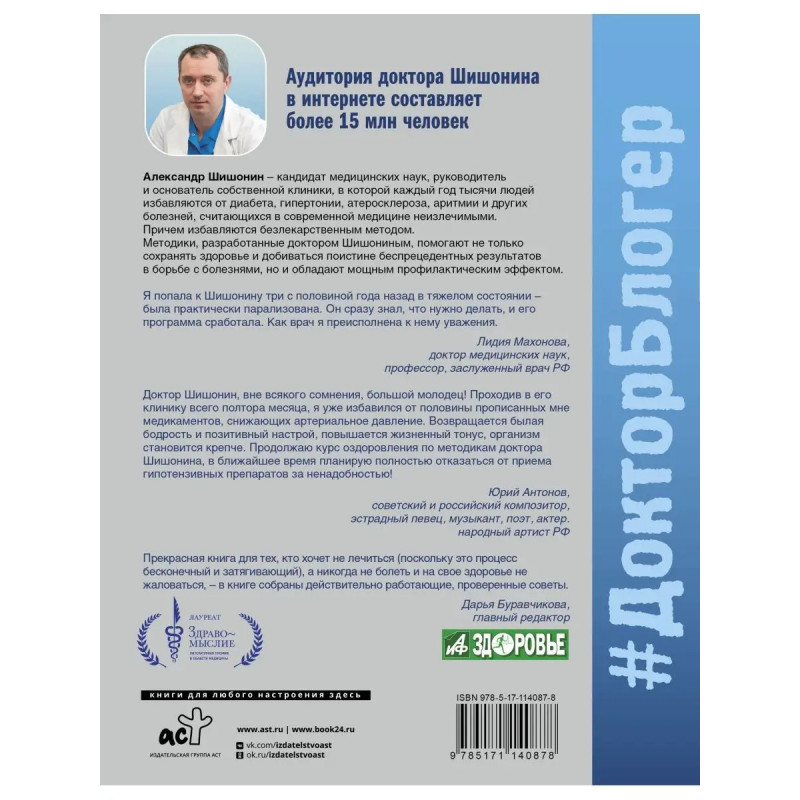 Александр Шишонин кандидат медицинских наук, руководитель и основатель собственной клиники, в которой каждый год тысячи людей, благодаря авторским методикам, избавляются от диабета, гипертонии, атеросклероза, аритмии и других болезней, считающихся в современной медицине неизлечимыми. А главное без помощи лекарств! Авторские методики доктора Шишонина помогут не только побороть болезнь, но и окажут мощный профилактический эффект.
