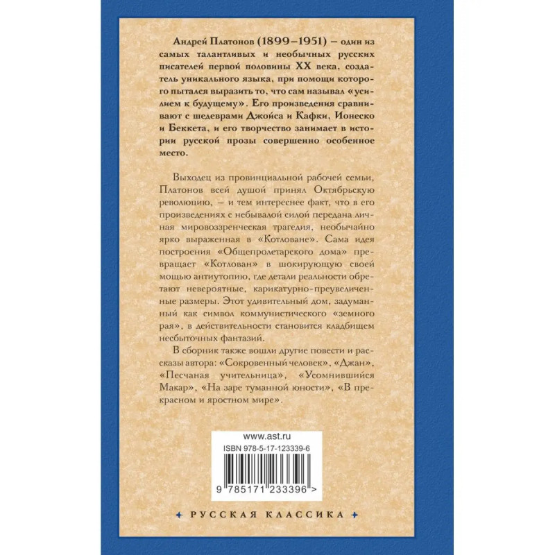 Выходец из провинциальной рабочей семьи, Платонов всей душой принял Октябрьскую революцию, и тем интереснее факт, что в его произведениях с небывалой силой передана личная мировоззренческая трагедия, необычайно ярко выраженная в "Котловане". Сама идея построения "Общепролетарского дома" превращает "Котлован" в шокирующую своей мощью антиутопию, где детали реальности обретают невероятные, карикатурно-преувеличенные размеры. Этот удивительный дом, задуманный как символ коммунистического "земного рая", в действительности становится кладбищем несбыточных фантазий. В сборник также вошли другие повести и рассказы автора: "Сокровенный человек", "Джан", "Песчаная учительница", "Усомнившийся Макар", "На заре туманной юности", "В прекрасном и яростном мире".