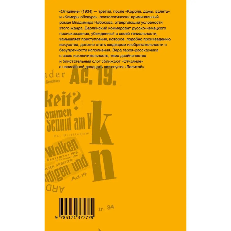 Захватывающий литературный триллер. Роман был экранизирован в 1978 году Райнером Вернером Фасбиндером, сценарий к фильму написал Том Стоппард. Для своего шестого русскоязычного романа "Отчаяние" Владимир Набоков выбирает криминальную фабулу. Русский коммерсант средней руки Герман проживает в Берлине и занимается продажей шоколада. Дела его идут из рук вон пл.оxо. Как-то раз, будучи в Праге, он встречает бездомного Феликса, который выглядит двойником главного героя. Герман решает переодеть Феликса в свою одежду, убить его и скрыться по его именем в другой стране. Жена Феликса Лида тем временем получит страховку за мнимую смерть своего мужа и приедет к нему. Этот зачин остросюжетного детективного триллера при более внимательном рассмотрении оказывается тонкой и изощренной пародией и на Достоевского с его двойничеством, и на Фрейда с его психоанализом. Набоков, ловко жонглируя культурными кодами и литературными реминисценциями, продолжает играть с читателями и критиками. И делает это безупречно. Роман печатается