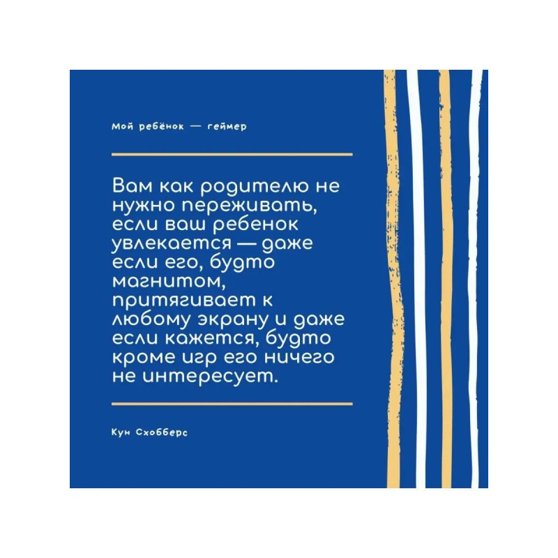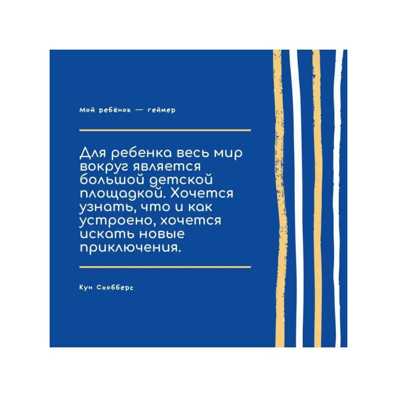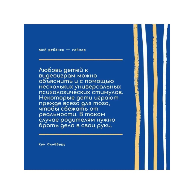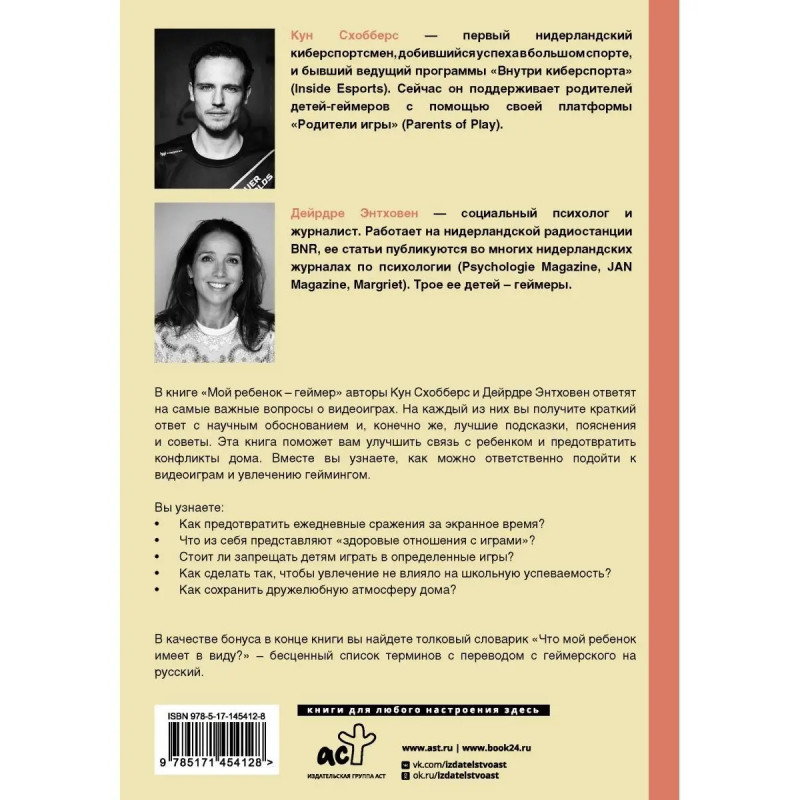 Многие современные дети проводят большую часть своего времени за играми. Во многих случаях это приводит членов семьи к стрессу. Кто-то засекает время, отведенное для игр, кто-то придумывает строгие правила или запреты: несмотря на все старания, и родители, и дети часто остаются недовольны решением, а построить конструктивный диалог не выходит. Мой ребенок геймер. Всё, что нужно знать родителю книга, которая поможет направить увлечение вашего ребенка в правильное русло. Вы узнаете, как правильно подойти к ситуации таким образом, чтобы ребенок оставался доволен, не делая при этом видеоигры центром своей и вашей жизни, и смог избежать негативных последствий от чрезмерного гейминга.