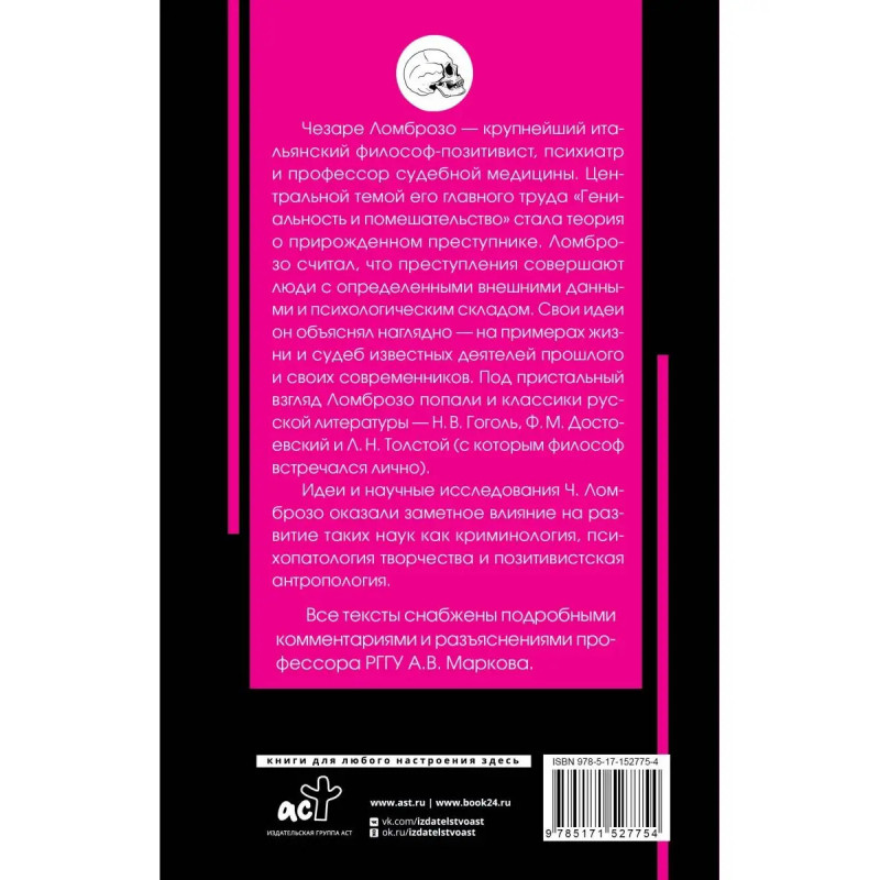Чезаре Ломброзо крупнейший итальянский философ-позитивист, психиатр и профессор судебной медицины. Центральной темой его главного труда "Гениальность и помешательство" стала идея о прирожденном преступнике. Ломброзо считал, что преступления совершают люди с набором определенных внешних данных и психологических характеристик. Будучи родоначальником оригинальной концепции творчества как сочетания патологических состояний, Ламброзо объяснял вдохновение как неразумное использование психической энергии, которое порождает оригинальные результаты и способствует прогрессу культуры. Его идеи и научные исследования оказали заметное влияние на развитие таких наук как криминология, психопатология творчества и позитивистская антропология. Все тексты снабжены подробными комментариями и разъяснениями профессора РГГУ А.В. Маркова.