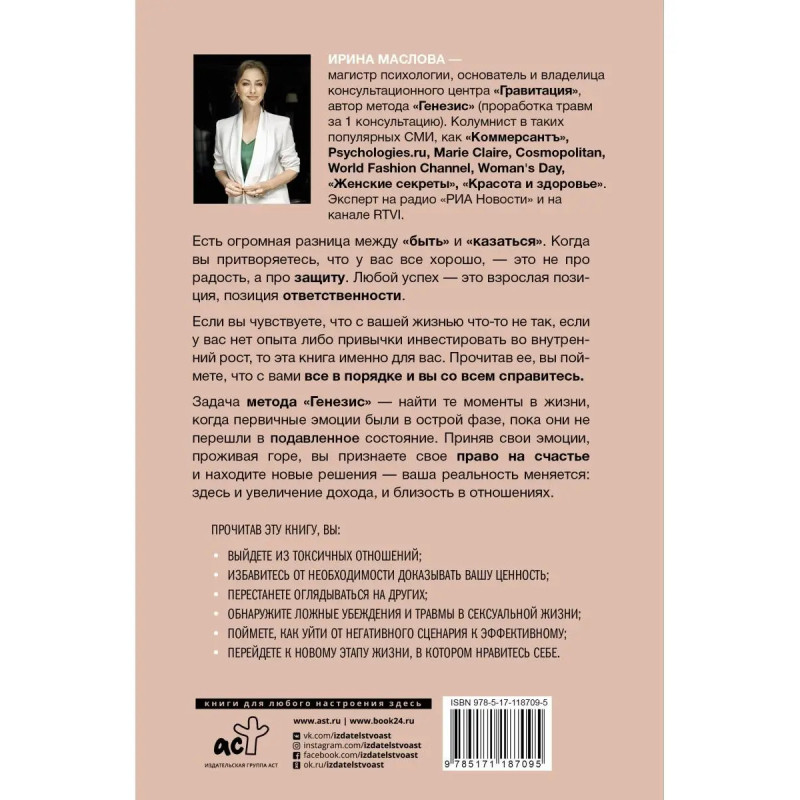 Ирина Маслова магистр психологии, основатель и владелица консультационного центра Гравитация, автор метода Генезис (проработка травм за 1 консультацию). Колумнист в таких популярных СМИ, как Коммерсантъ, Psychologies(точка)ru, Marie Claire, Cosmopolitan, World Fashion Channel, Woman's Day, Женские секреты, Красота и здоровье. Эксперт на радио РИА Новости и на канале RTVI. Прочитав эту книгу, вы: выйдете из токсичных отношений; избавитесь от необходимости доказывать вашу ценность; перестанете оглядываться на других; обнаружите ложные убеждения и травмы в сексуальной жизни; поймете, как уйти от негативного сценария к эффективному; перейдете к новому этапу жизни, в котором нравитесь себе.