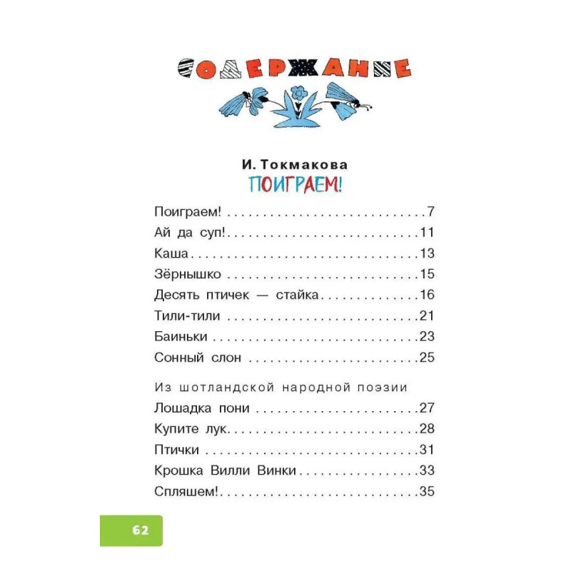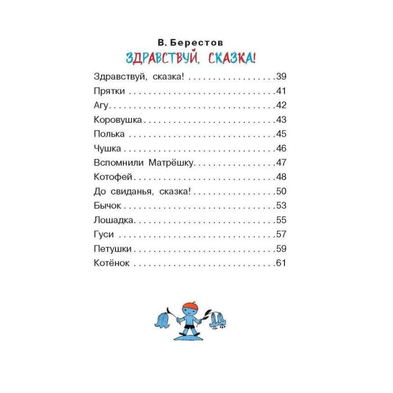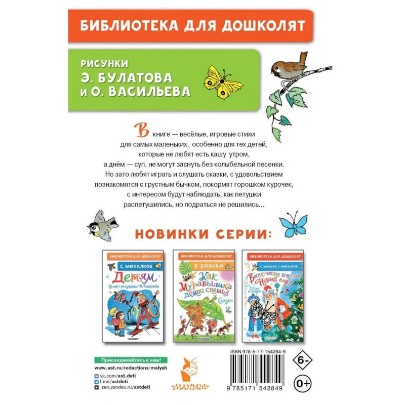 В книге весёлые, игровые стихи В. Берестова и И. Токмаковой для самых маленьких, особенно для тех детей, которые не любят есть кашу утром, а днём суп, не могут заснуть без колыбельной песенки. Но зато любят играть и слушать сказки, с удовольствием познакомятся с грустным бычком, покормят горошком курочек, с интересом будут наблюдать, как петушки распетушились, но подраться не решились...