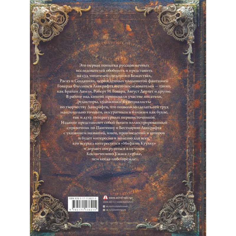 Это первая попытка русскоязычных исследователей обобщить и представить на суд читателей сведения о Божествах, Расах и Созданиях, порожденных плодовитой фантазией Говарда Филлипса Лавкрафта и его последователей таких, как Брайан Ламли, Роберт И. Говард, Август Дерлет и другие. В работе над книгой принимали участие писатели, редакторы, художники и специалисты по творчеству Лавкрафта, что позволило сделать сей труд максимально точным, аккуратным и близким как букве, так и духу литературных первоисточников. Издание представляет собой богато иллюстрированный справочник по Пантеону и Бестиарию Лавкрафта с указанием названий, имен, произведений и авторов, и будет интересно и полезно для всех, кто всерьез интересуется Мифами Ктулху и дерзает погрузиться в пучины Космического Ужаса глубже, чем когда-либо прежде.