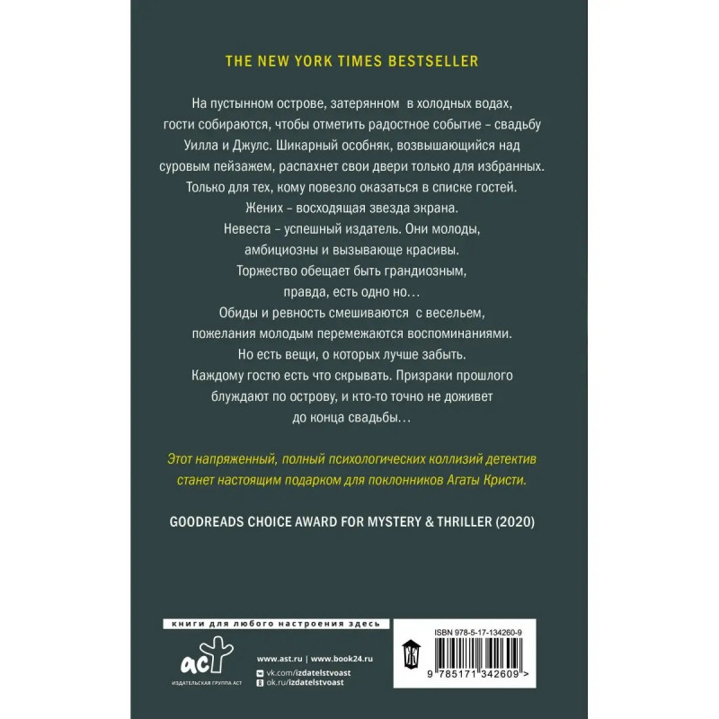 Блестящий образец герметичного детектива, который по достоинству оценят поклонники Агаты Кристи. Бестселлер по версии The New York Times, покоривший миллионы читателей по всему миру. Выбор книжного клуба Риз Уизерспун. Победитель премии The Goodreads Choice Awards. На одиноком острове, окруженном холодными водами, грядет знаменательное событие. Уилл популярный актер, Джулс успешная издательница, они готовятся сыграть свадьбу в стенах роскошного особняка, величественно возвышающегося над суровым пейзажем. В их списке гостей только избранные, а празднество должно стать событием века. Жених и невеста идеальная пара. Или так только кажется? Праздник набирает обороты, но в свадебной суматохе никто не заметил, что тени прошлого тоже решили заявиться на торжество, чтобы напомнить о событиях, которые многие предпочли бы забыть Кто-то точно не доживет до конца свадьбы. Но кто станет жертвой, а кто убийцей?