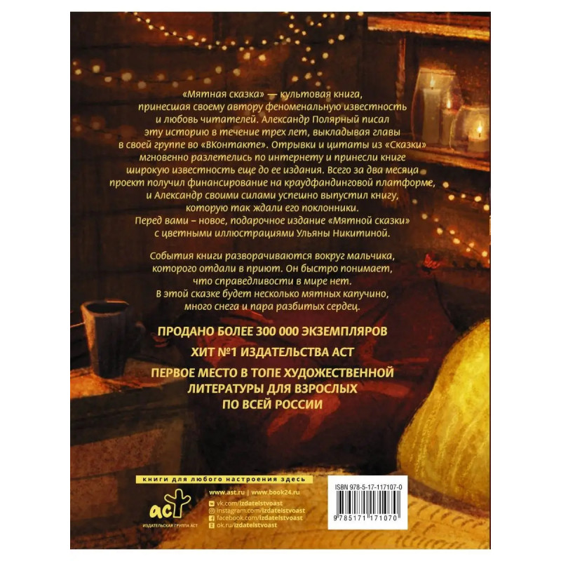 "Мятная сказка" культовая книга, принесшая своему автору феноменальную известность и любовь читателей. Александр Полярный писал эту историю в течение трех лет, выкладывая главы в своей группе во "ВКонтакте". Отрывки и цитаты из "Сказки" мгновенно разлетелись по интернету и принесли книге широкую известность еще до ее издания. Всего за два месяца проект получил финансирование на краудфандинговой платформе, и Александр своими силами успешно выпустил книгу, которую так ждали его поклонники. Перед вами новое, подарочное издание "Мятной сказки" с цветными иллюстрациями Ульяны Никитиной. События книги разворачиваются вокруг мальчика, которого отдали в приют. Он быстро понимает, что справедливости в мире нет. В этой сказке будет несколько мятных капучино, много снега и пара разбитых сердец.