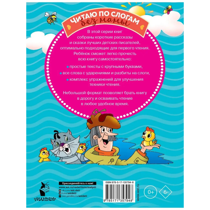 В серии "Читаю без мамы по слогам" собраны короткие истории и сказки любимых детских писателей, оптимально подходящие для первого чтения. Ребёнок легко и с удовольствием прочитает всю книгу самостоятельно: - простые тексты с крупными буквами, - слова с ударениями и разбиты на слоги, - комплекс упражнений для улучшения техники чтения. Пять причин купить книги серии: - удобный, мобильный, небольшой формат - лучшие произведения мировой детской литературы - качественная полиграфия, яркие иллюстрации - эффективные упражнения для улучшения техники чтения - идеальное соотношение "цена-качество"