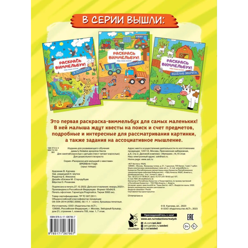 Это первая раскраска-виммельбух для самых маленьких! В ней малыша ждут квесты на поиск и счет предметов, подробные и интересные для рассматривания картинки, а также задания на ассоциативное мышление.