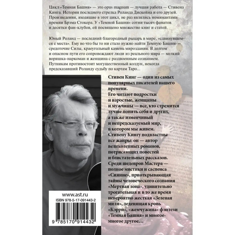 Цикл "Темная Башня" это opus magnum лучшая работа Стивена Кинга. История последнего стрелка Роланда Дискейна и его друзей. Произведения, входящие в этот цикл, не раз являлись номинантами премии Брэма Стокера. У "Темной Башни" сотни тысяч фанатов и десятки фан-клубов, ей посвящено множество книг и статей. Юный Роланд последний благородный рыцарь в мире, "сдвинувшемся с места". Ему во что бы то ни стало нужно найти Темную Башню средоточие Силы, краеугольный камень мироздания. В долгом и опасном пути его сопровождают люди из реального мира мелкий воришка-наркоман и женщина с раздвоенным сознанием. Путникам противостоит могущественный колдун "человек в черном", некогда предсказавший Роланду судьбу по картам Таро...