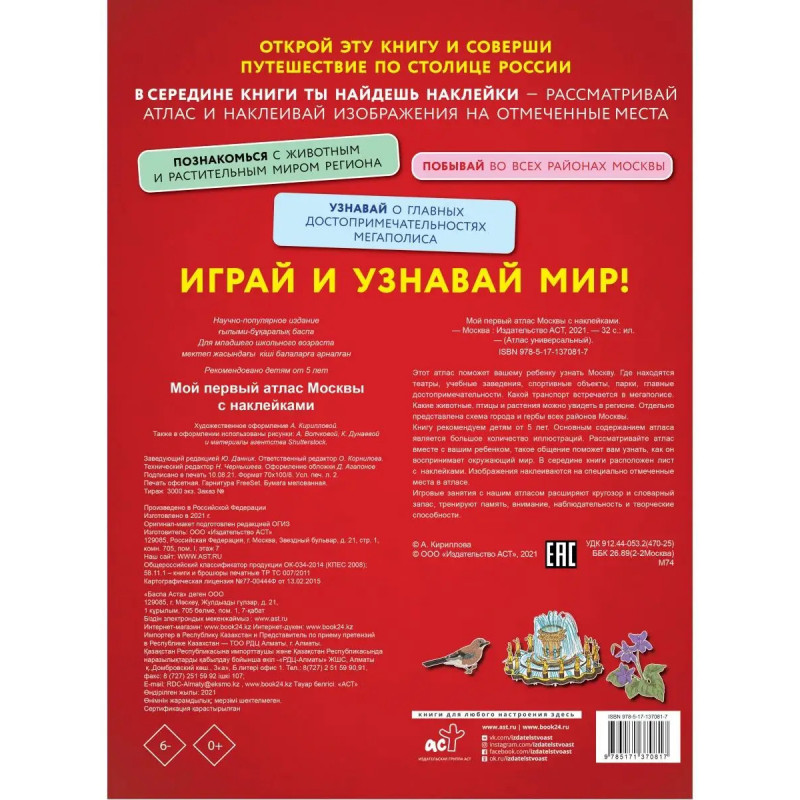 Атлас поможет вашему ребенку узнать Москву: где находятся театры, учебные заведения, спортивные объекты, парки, главные достопримечательности. Какой транспорт встречается в мегаполисе. Каких животных, птиц и какие растения можно увидеть в регионе. Отдельно представлена схема города и гербы всех районов Москвы. Книгу рекомендуем детям от 5 лет. Основным содержанием атласа является большое количество иллюстраций. Рассматривайте атлас вместе с вашим ребенком, такое общение поможет вам узнать, как он воспринимает окружающий мир. В середине книги расположен лист с наклейками. Изображения наклеиваются на специально отмеченные места в атласе. Игровые занятия с нашим атласом расширяют кругозор и словарный запас, тренируют память, внимание, наблюдательность и творческие способности.