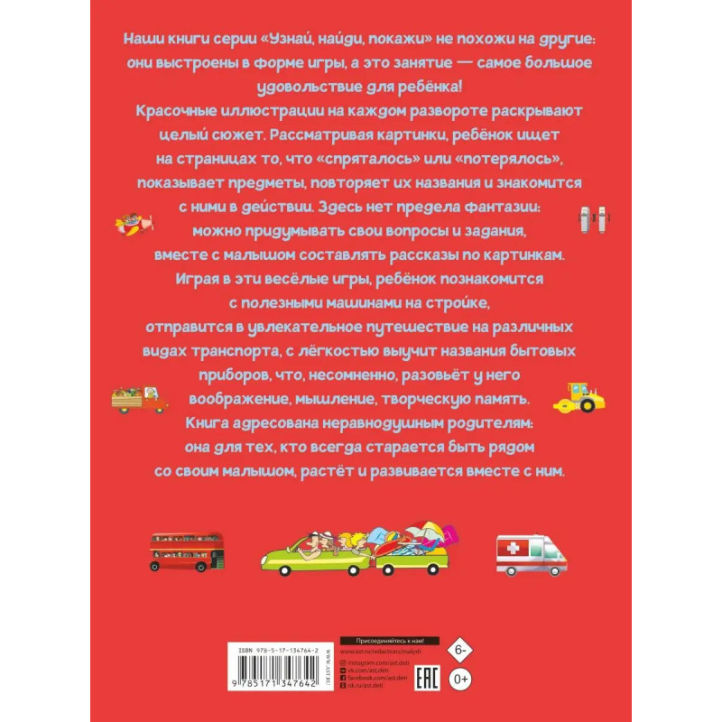 Перед вами не просто книга "Техника и транспорт", а познавательная игра. Именно во время игры ребёнок знакомится сокружающим миром, развивает фантазию, тренирует память и проявляет свои творческие способности. На каждом развороте его ждут красочные иллюстрации, которые логически объединены одним сюжетом. Малыш увидит, какие бытовые приборы есть в каждом доме, побывает на строительной площадке и в аэропорту, где техника очень помогает людям. А ещё он узнает, зачем человек изобрёл полезные машины, и отправится в большое путешествие на разных видах транспорта. Играя, ребёнок быстро выучит названия машин и приборов, запомнит действия, которые с ними можно совершать, научится рассуждать иотвечать на вопросы. А если ему пока трудно найти что-то на странице - мама всегда поможет. Подарите своему малышу весёлые минуты увлекательной игры! Для дошкольного возраста.