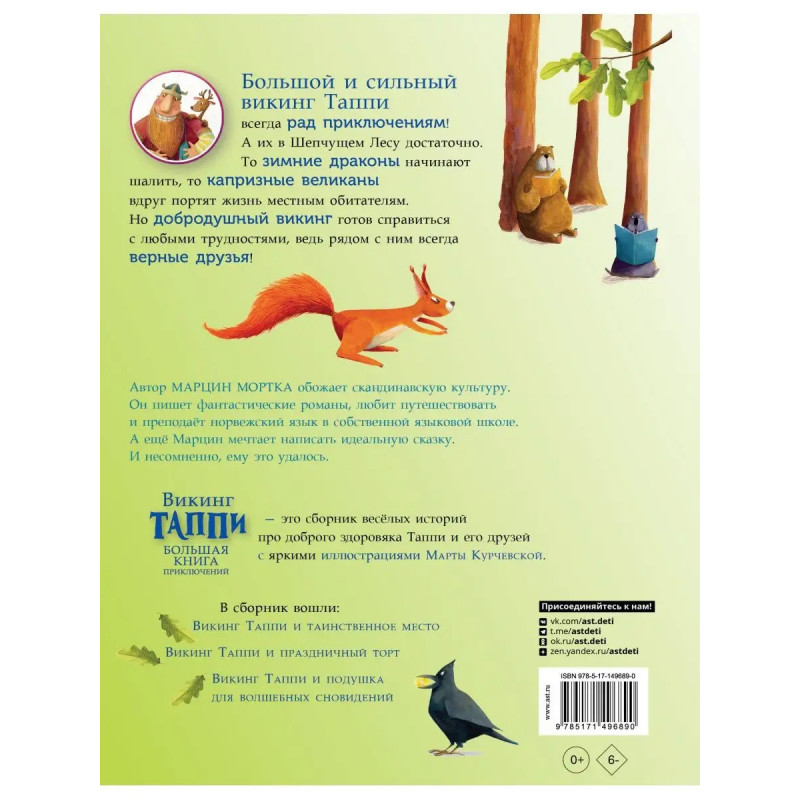 Редакция "Вилли Винки" представляет! Целый сборник сказок о приключениях добряка-викинга и его друзей! Красочные истории о драконах, великанах, зверятах, гномах в этой большой книге поместилось сразу три книги поменьше: "Таппи и таинственное место", "Таппи и праздничный торт", "Таппи и подушка для волшебных снов". Каждая история содержит ненавязчивый поучительный смысл. Читатели запомнят и выучат важные правила поведения и безопасности, научатся по-настоящему дружить и быть ответственными. Автор Марцин Мортка обожает скандинавскую культуру. Он пишет фантастические романы, любит путешествовать и преподаёт норвежский язык в собственной языковой школе. А ещё Марцин мечтает написать идеальную сказку. И, несомненно, ему это удалось. "Большая книга приключений викинга Таппи" это сборник весёлых историй про доброго здоровяка Таппи и его друзей с яркими иллюстрациями Марты Курчевской. В сборник вошли "Викинг Таппи и таинственное место", "Викинг Таппи и праздничный торт", "Викинг Таппи и подушка для волшебных снов