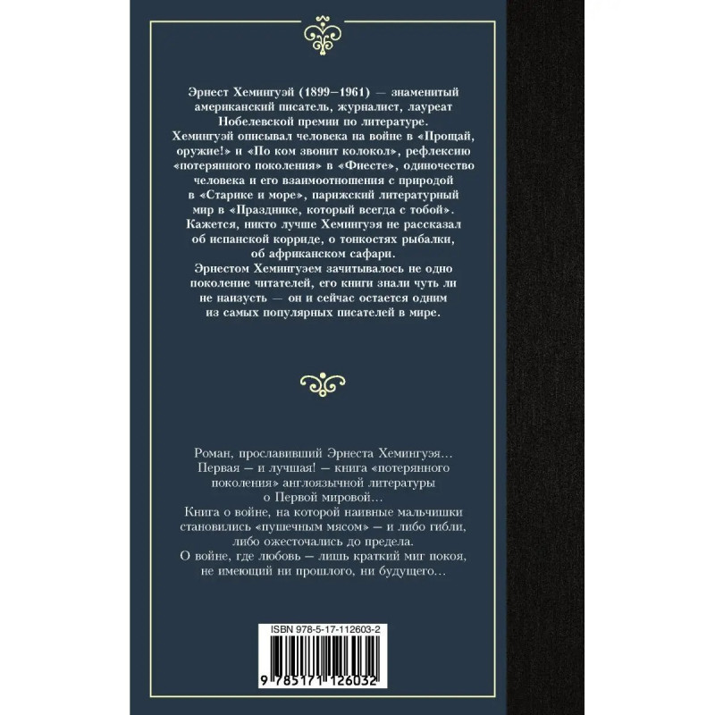 "Прощай, оружие!" Роман, прославивший Эрнеста Хемингуэя Первая и лучшая! книга "потерянного поколения" англоязычной литературы о Первой мировой Книга о войне, на которой наивные мальчишки становились "пушеч-ным мясом" и либо гибли, либо ожесточались до предела. О войне, где любовь лишь краткий миг покоя, не имеющий ни прошлого, ни будущего
