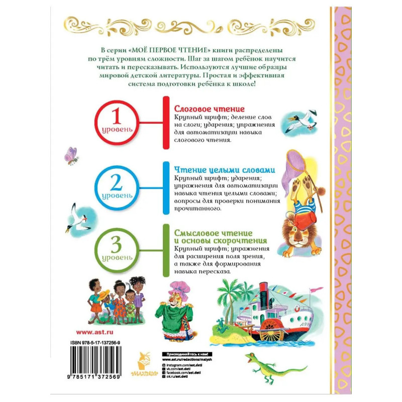 5 причин купить книги серии: - лучшие классические тексты, понятные и интересные дошкольникам - уровни автоматизации навыка чтения - простые и эффективные тренировочные упражнения - регулярное отслеживание успехов малыша - пальчиковая гимнастика для концентрации внимания В серии МОЁ ПЕРВОЕ ЧТЕНИЕ книги распределены по трём уровням сложности. Шаг за шагом ребёнок научится читать и пересказывать. Используются лучшие образцы мировой детской литературы. Простая и эффективная система подготовки ребёнка к школе! Уровень 1. Слоговое чтение Крупный шрифт; деление слов на слоги; ударения; упражнения для автоматизации навыка слогового чтения. Уровень 2. Чтение целыми словами Крупный шрифт; ударения; упражнения для автоматизации навыка чтения целыми словами; вопросы для проверки понимания прочитанного. Уровень 3. Смысловое чтение и основы скорочтения Крупный шрифт; упражнения для расширения поля зрения, а также для формирования навыка пересказа.