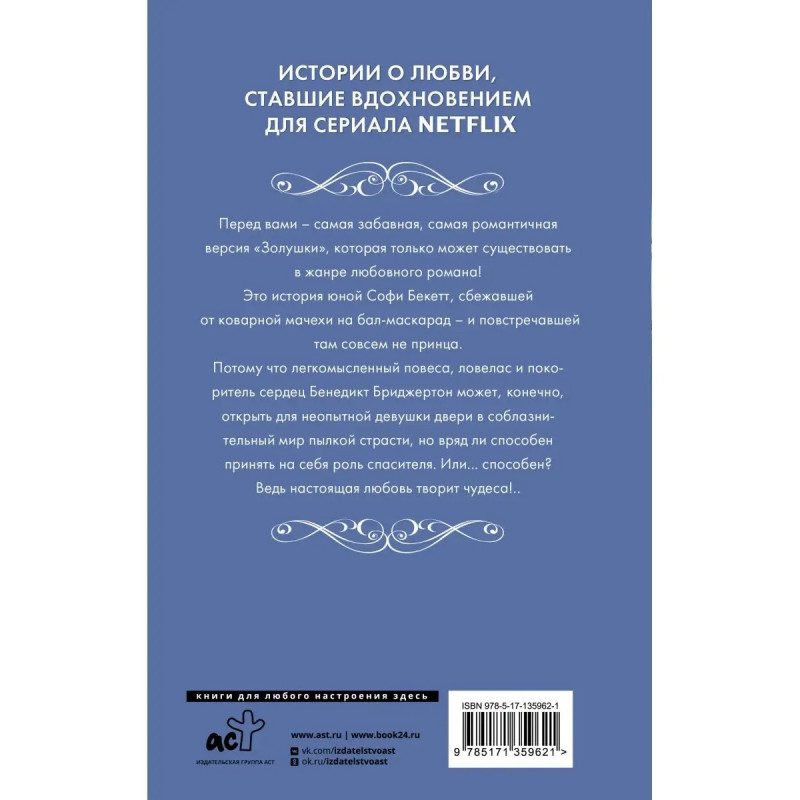 Предложение джентльмена уже третья часть культового цикла Джулии Куин Бриджертоны, который лёг в основу одноимённого сериала производства потокового сервиса Netflix. Бриджертоны стали самым популярным сериалом платформы, за первый месяц шоу посмотрело свыше 9 миллионов домохозяйств. В настоящий момент ведётся подготовка ко съёмкам второго сезона. Каждый из восьми романов цикла устраивает судьбу одного из восьми отпрысков семейства Бриджертонов. На этот раз настал черед Бенедикта легкомысленного ловеласа, повесы и покорителя сердец. И его история самая романтичная, милая и головокружительная версия сказки о Золушке. Юная Софи Беккет устала от опеки ненавистной мачехи. Мечтая найти настоящую любовь и обрести собственного принца на белом коне, Софи сбегает из дому и отправляется на бал-маскарад, который устраивает леди Бриджертон. Там её мечты сбываются, но встречает Софи совсем не принца. Но любое волшебство длится только до полуночи, после чего карета превращается в тыкву, а кони в мышей. Сможет
