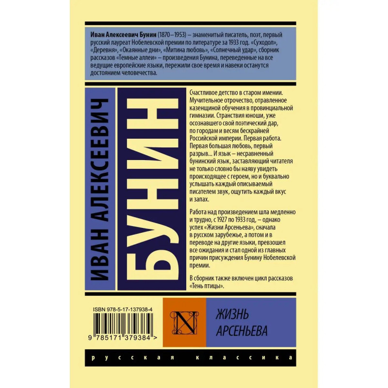 Счастливое детство в старом имении. Мучительное отрочество, отравленное казенщиной обучения в провинциальной гимназии. Странствия юноши, уже осознавшего свой поэтический дар, по городам и весям бескрайней Российской империи. Первая работа. Первая большая любовь, первый разрыв... И язык несравненный бунинский язык, заставляющий читателя не только словно бы наяву увидеть происходящее с героем, но и буквально услышать каждый описываемый писателем звук, ощутить каждый вкус и запах. Работа над произведением шла медленно и трудно, с 1927 по 1933 год, однако успех "Жизни Арсеньева", сначала в русском зарубежье, а потом и в переводе на другие языки, превзошел все ожидания и стал одной из главных причин присуждения Бунину Нобелевской премии. В сборник также включен цикл рассказов "Тень птицы".