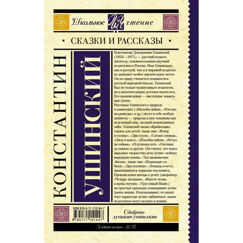 Константин Дмитриевич Ушинский (18231871) русский педагог, писатель, основоположник научной педагогики в России. Имя Ушинского, как в русской, так и в мировой педагогике занимает особое значительное место. Он по праву считается основателем русской народной школы. Ушинский был не только талантливым педагогом, но и замечательным детским писателем. Его произведения наглядные моральные уроки. Рассказы Ушинского о природе и животных (Жалобы зайки, Пчелки на разведке и др.) несут в себе особую ценность природа в них показана, как неделимый мир, полный неизведанных тайн. Ушинский также обрабатывал сказки для детей, такие как: Ветер и солнце, Два плуга, Слепая лошадь, Лиса и козел, Жалобы зайки, Петух да собака, Плутишка кот, Охотник до сказок и других. Он считал, что через народное творчество дети лучше поймут народную жизнь. Так называемые басни такие как: Играющие собаки, Два козлика, Лошадь и осел заканчиваются моралью-поучением. Произведения автора о детях (например, Четыр